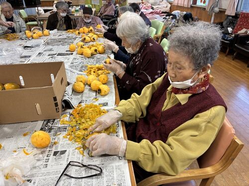 毎年恒例となっている、デイサービスでの干し柿づくり。今年もその時の様子をご紹介します。 最初は皮むきです。たくさんあった柿も、皆さんでやるとあっという間に全部むき終わりました。 むいた柿のヘタを紐で結んでいきます。 竿につるして、外へ運びます…